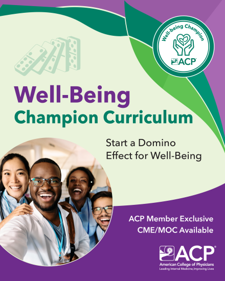 ACP Chapter Well-Being Leaders! To help create a shared language around physician well-being, ACP National is excited to announce that the ACP Well-being Champion curriculum is available as a free, member-exclusive resource. The official launch will be recognized on March 18, 2026, in conjunction with the National Academy of Medicine’s Health Workforce Well-Being Day. We encourage you to use the Well-being Champion Curriculum toolkit to promote awareness of this initiative. The link to the toolkit is below.