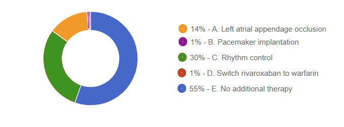 Rhythm control (Option C) is the most appropriate treatment for this patient who presents with paroxysmal atrial fibrillation. This patient is reflective of those included in the EAST-AFNET 4 randomized clinical trial, which evaluated a rhythm control strategy versus usual care (typically including rate control) in patients with a recent diagnosis (within 12 months) of atrial fibrillation and coexisting cardiovascular conditions. The inclusion criteria were age older than 75 years or previous transient ischemic attack or stroke, or two of the following: age older than 65 years, female sex, heart failure, hypertension, diabetes mellitus, severe coronary artery disease, chronic kidney disease, and left ventricular hypertrophy. The trial demonstrated improved clinical outcomes, including a reduction in the primary composite end point of cardiovascular death, stroke, or hospitalization for heart failure or acute coronary syndrome, among patients randomly assigned to an early rhythm control strategy, including asymptomatic patients. The intervention included either antiarrhythmic drugs or catheter ablation, but importantly, it included aggressive concomitant medical therapy (e.g., oral anticoagulation when indicated, hypertension treatment) in both the intervention and the control groups. Based on the trial results, this patient is mostly likely to benefit from early rhythm control for atrial fibrillation.