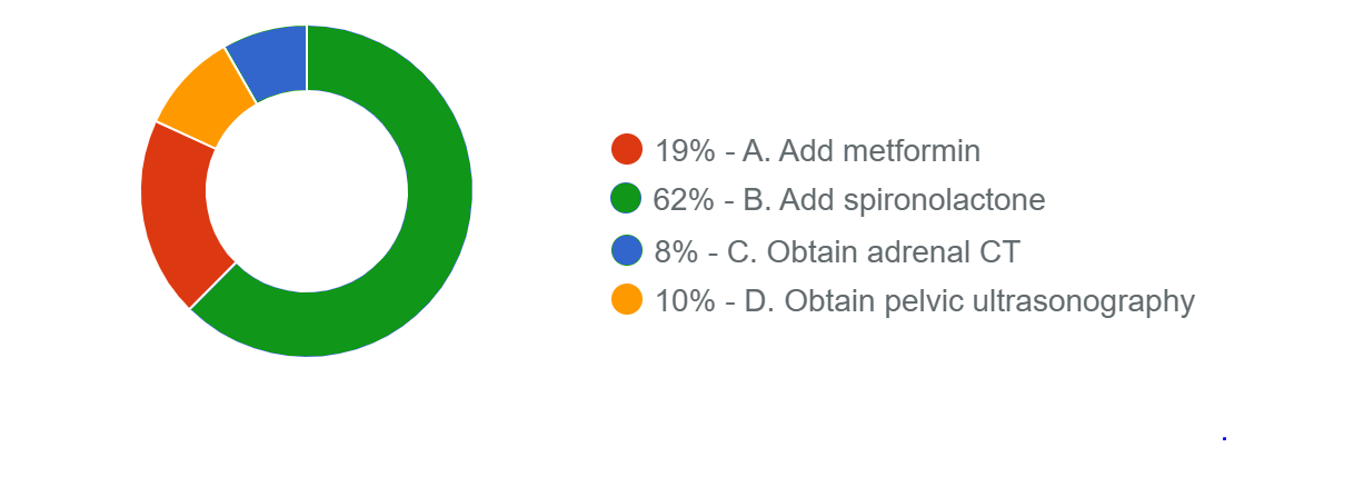 The most appropriate next step is to add spironolactone (Option B). Polycystic ovary syndrome (PCOS) is a disorder characterized by hyperandrogenism and ovulatory dysfunction. PCOS affects 6% to 10% of women and is the most common cause of anovulatory infertility in women. It is associated with rapid gonadotropin-releasing hormone pulses, an excess of luteinizing hormone, and insufficient follicle-stimulating hormone secretion, resulting in excessive ovarian androgen production and ovulatory dysfunction. PCOS is accompanied by insulin resistance. Elevated insulin levels in PCOS further enhance ovarian and adrenal androgen production, as well as increase bioavailability of androgens related to a reduction in sex hormone-binding globulin. PCOS is associated with increased incidence of metabolic syndrome, prediabetes, type 2 diabetes mellitus, hypercholesterolemia, and obesity. This patient with PCOS has evidence of ongoing hirsutism (i.e., dark coarse hair on the face, chest, back, arms/legs) and acne despite 6 months of oral contraceptive therapy. The next step is to add an antiandrogen agent to oral contraceptive therapy. Spironolactone is the most commonly used antiandrogen agent and is generally safe and well tolerated. Potential adverse effects include hyperkalemia (rare in patients with normal renal function), gastrointestinal discomfort, and irregular menstrual bleeding. In women prescribed spironolactone, concomitant contraception is mandatory because of teratogenesis in male fetuses.