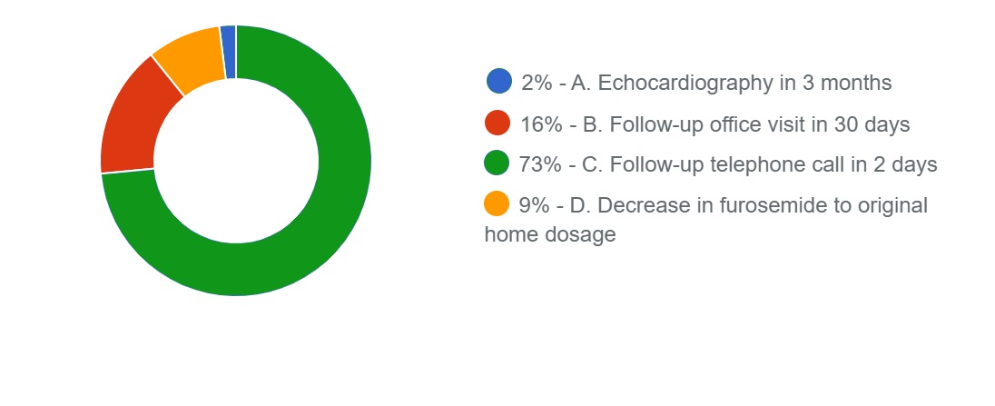 A telephone call within 2 to 3 days (Option C) is recommended to prevent this patient's early readmission to the hospital. The 2019 American College of Cardiology expert consensus decision pathway for patients hospitalized with heart failure notes that up to 25% of patients are readmitted with heart failure within 30 days of the index hospitalization. Two key elements are associated with a successful transition from hospital to home: a follow-up phone call within 2 to 3 days of discharge and an office visit within 7 to 14 days of hospital discharge. The purpose of the follow-up phone call is to address signs of congestion, provide education and review adherence to the medication regimen, and confirm follow-up appointments and adequate transportation. The expert consensus decision pathway recommends a standardized approach to the follow-up telephone call, including use of a checklist to help organize the call.